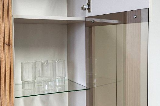 Вторая дверь, выполненная со стеклянной вставкой, позволяет демонстрировать коллекции, декоративные предметы или книги, придавая вашему пространству дополнительный шарм и элегантность.