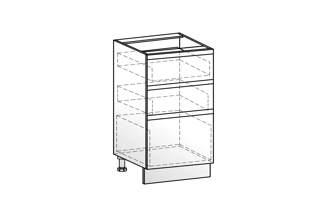 Рабочий шкаф с тремя вместительными выкатными ящиками — практичное решение для удобной организации хранения. Верхний ящик идеально подходит для размещения столовых приборов и мелких аксессуаров, средний и нижний — для кастрюль, сковород и другой кухонной утвари. Фасады выполнены из МДФ 19 мм, а направляющие на ящиках Слим обеспечивают плавное, тихое и комфортное использование каждый день.