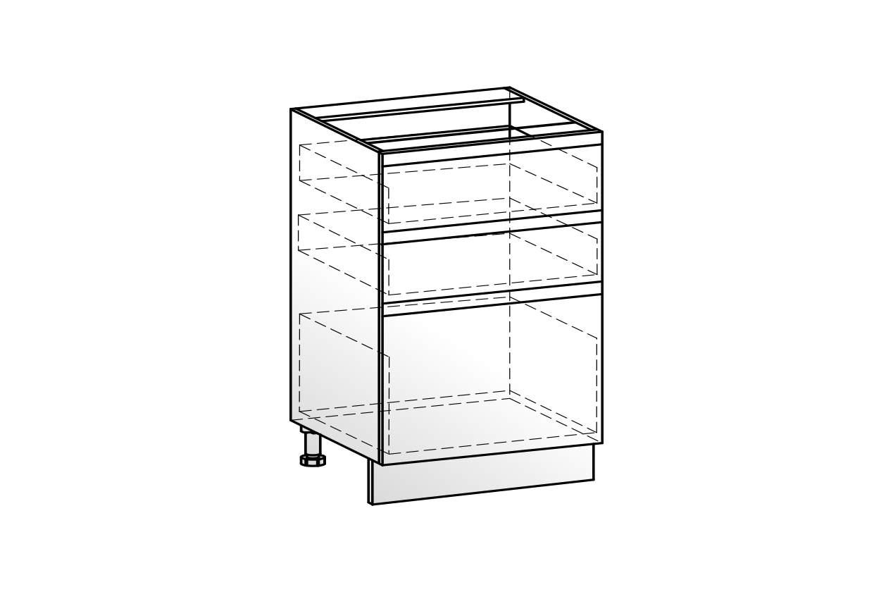 Рабочий шкаф с тремя вместительными выкатными ящиками — практичное решение для удобной организации хранения. Верхний ящик идеально подходит для размещения столовых приборов и мелких аксессуаров, средний и нижний — для кастрюль, сковород и другой кухонной утвари. Фасады выполнены из МДФ 19 мм, а направляющие на ящиках Слим обеспечивают плавное, тихое и комфортное использование каждый день.