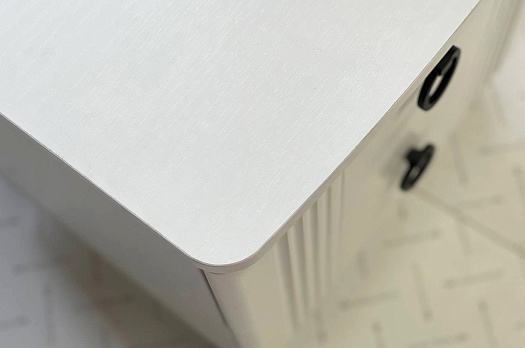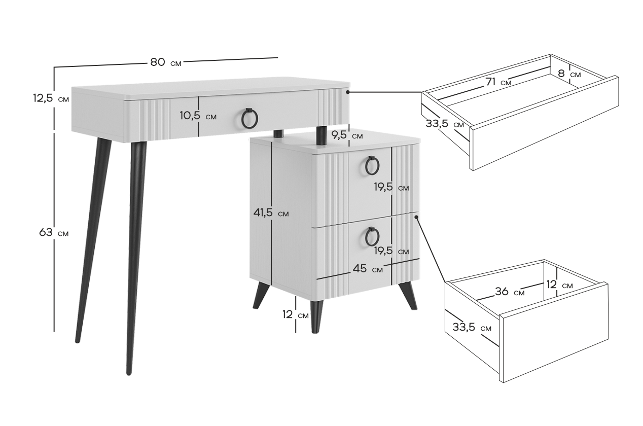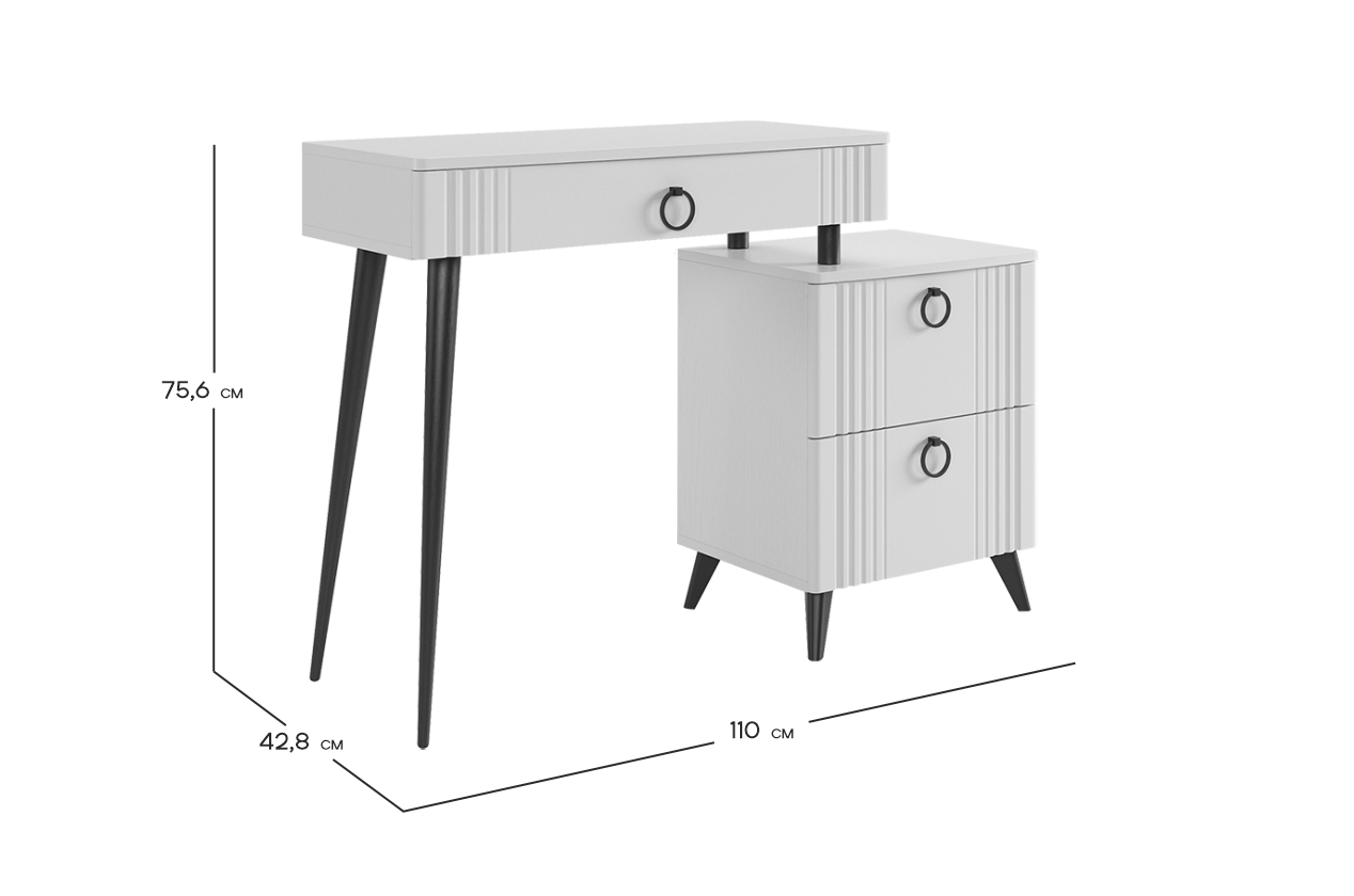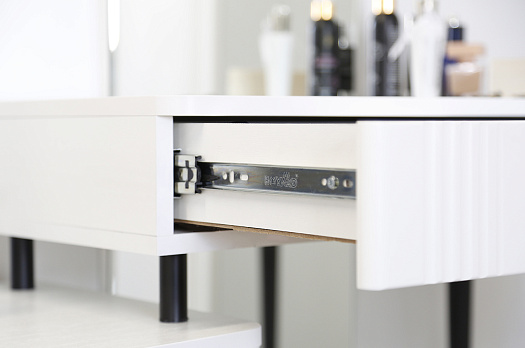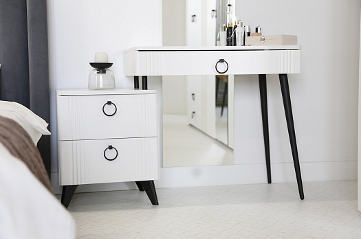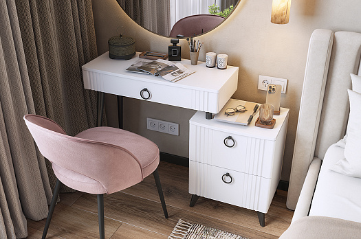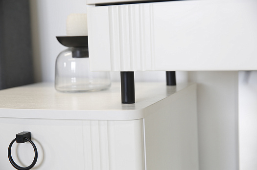 Туалетный столик  "Ева" прекрасно впишется в интерьер спальни или ванной комнаты благодаря своему стильному дизайну и функциональности. Вместительные выкатные ящики обеспечат удобное хранение косметики, украшений и других мелочей. Шариковые направляющие гарантируют легкость открывания и закрывания ящиков, а металлические ручки добавляют стильный акцент. Высокие черные опоры придают столику устойчивость и элегантность. Цветовое сочетание белого корпуса из ЛДСП и фасада из МДФ облицованного пленкой ПВХ создает свежий и модный образ мебели. Необычная фрезеровка фасада добавляет изысканности и утонченности этому туалетному столику.