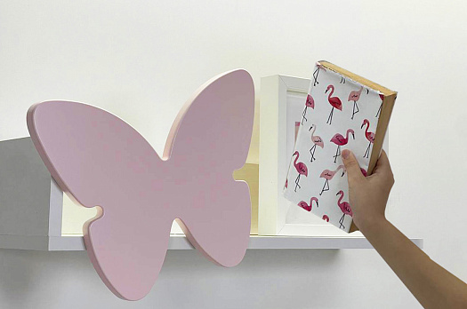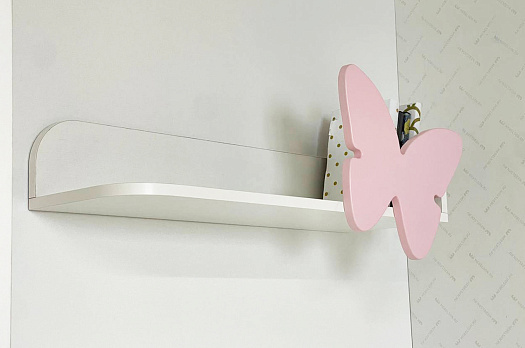 Изготовлена полка из качественных материалов: корпус из ЛДСП белого дерева придаст интерьеру легкость и свежесть, а декоративный элемент в виде бабочки из МДФ розового цвета эмаль внесет нотку игривости и нежности.