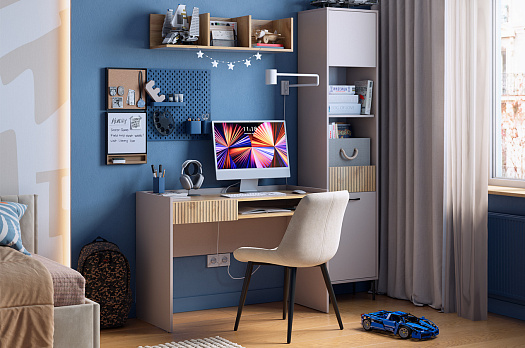 Корпус стола выполнен в цвете кашемир, что придает ему современный и спокойный вид, легко сочетающийся с любым интерьером. Выкатной ящик в цвете "дуб крафт золотой", декорирован принтом, имитирующим вертикальную фрезеровку, что добавляет столу уникальности и роскоши.