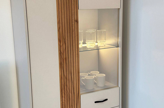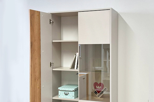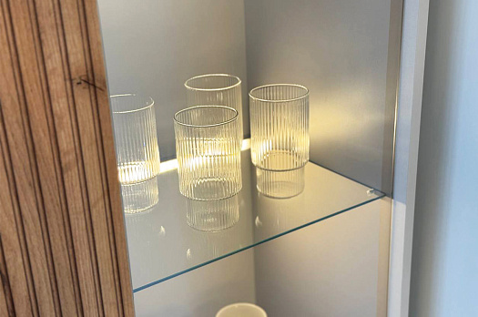 Вторая дверь, выполненная со стеклянной вставкой, позволяет демонстрировать коллекции, декоративные предметы или книги, придавая вашему пространству дополнительный шарм и элегантность.