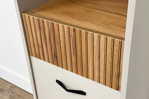 Особенностью стеллажа "Доминика" является выкатной ящик, который обеспечивает дополнительное пространство для хранения. Фасад ящика украшен декоративным элементом в цвете "дуб крафт золотой", придающим стеллажу элегантный и роскошный вид.