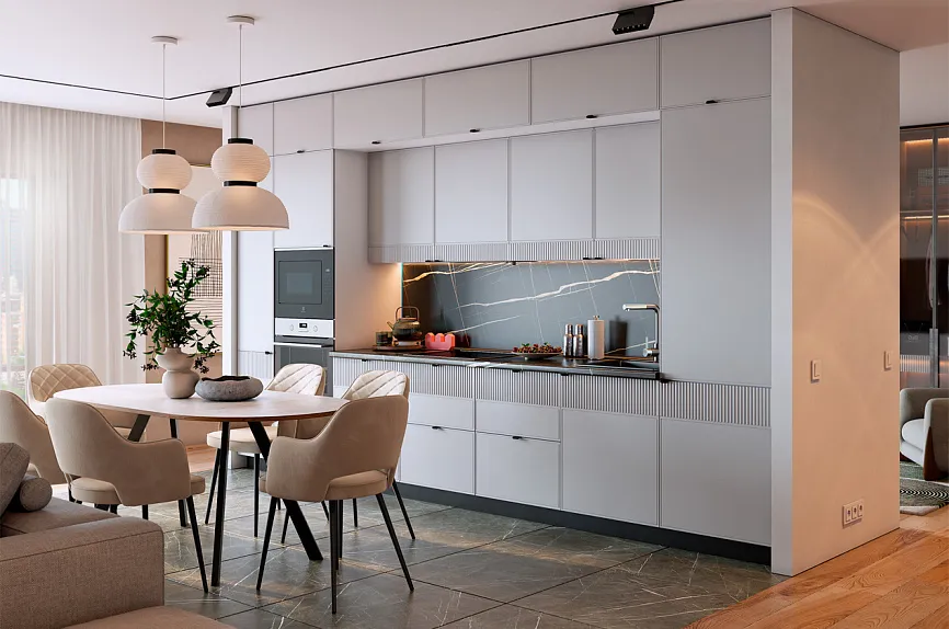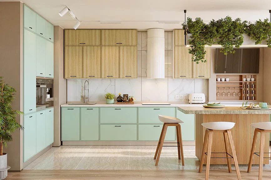 - Кухни с островом подходят для просторных помещений и станут центральным элементом интерьера, предоставляя дополнительную площадь для приготовления пищи и обеденную зону.
