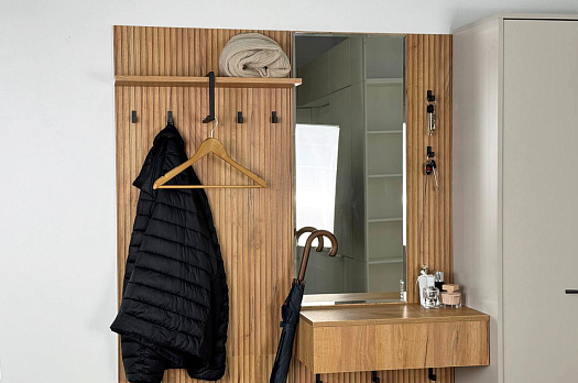 Принт, имитирующий вертикальную фрезеровку придает вешалке уникальный и современный вид, добавляя текстуру и глубину. Материал вешалки – ЛДСП, что обеспечивает прочность и долговечность, а также легкость в уходе.