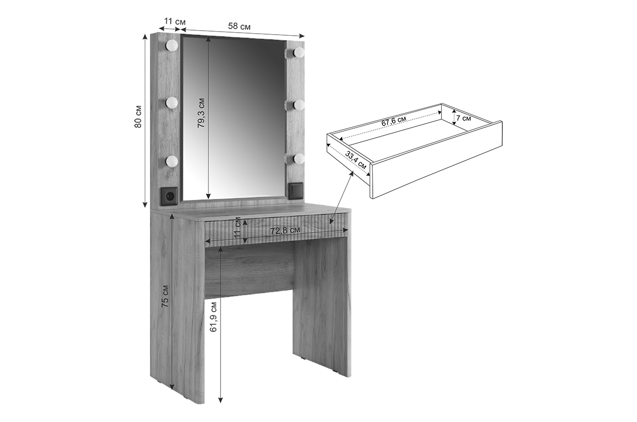 Трюмо Адам — это идеальное сочетание стиля и практичности. С широким фацетированным зеркалом, в котором встроена подсветка из 6 лампочек, оно создает атмосферу профессиональных студий визажистов прямо у вас дома. Комфорт и функциональность обеспечиваются дополнительными элементами, такими как выключатель, розетка для фена и выдвижной ящик для хранения украшений и косметики. Элегантные закругленные углы завершают дизайн, делая его идеальным дополнением к вашей спальне.